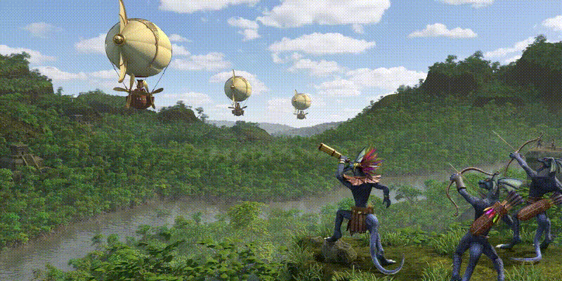 The next minute, an arrow hit the deck between us. I darted to the side; as we talked, our ship had lost so much altitude that our keel was almost scraping against the treetops! Only now could I make out a thing in this green sea. A mess of tall, crooked, twisted trunks, like a solid hedge. Over the muffled coughing of the engine, the sounds of the land rumbled: rustling, gurgling, chattering, squeaking... and I swear I could hear crazed cries coming from hundreds of mouths, as well as the roaring of some very big creatures. Arrows were flying out of the forest; most of them were launched with not nearly enough force to reach our ship, but a few did hit the sides and deck. Heavy, long, sharp arrows with motley plumage. “Dump the ballast! Now! We've got to gain altitude!", I shouted and rushed down to the faucets on the lower deck. We had taken on water as ballast, and now it had to be let out. As I went down the gangway—facing forward, as Boris, a seaman with decades of experience, had taught me—huge shadows flickered around our ship. I heard growls, hisses, the shouts of my frightened crew, and finally, the crackling as our balloon tore. Just moments earlier, we were still flying—granted, we were losing altitude and barely moving the propellers, but still waddling through the air—and now we were going down. No idea where to. No idea how far the ground and what is down there. All I wanted was to survive this. |